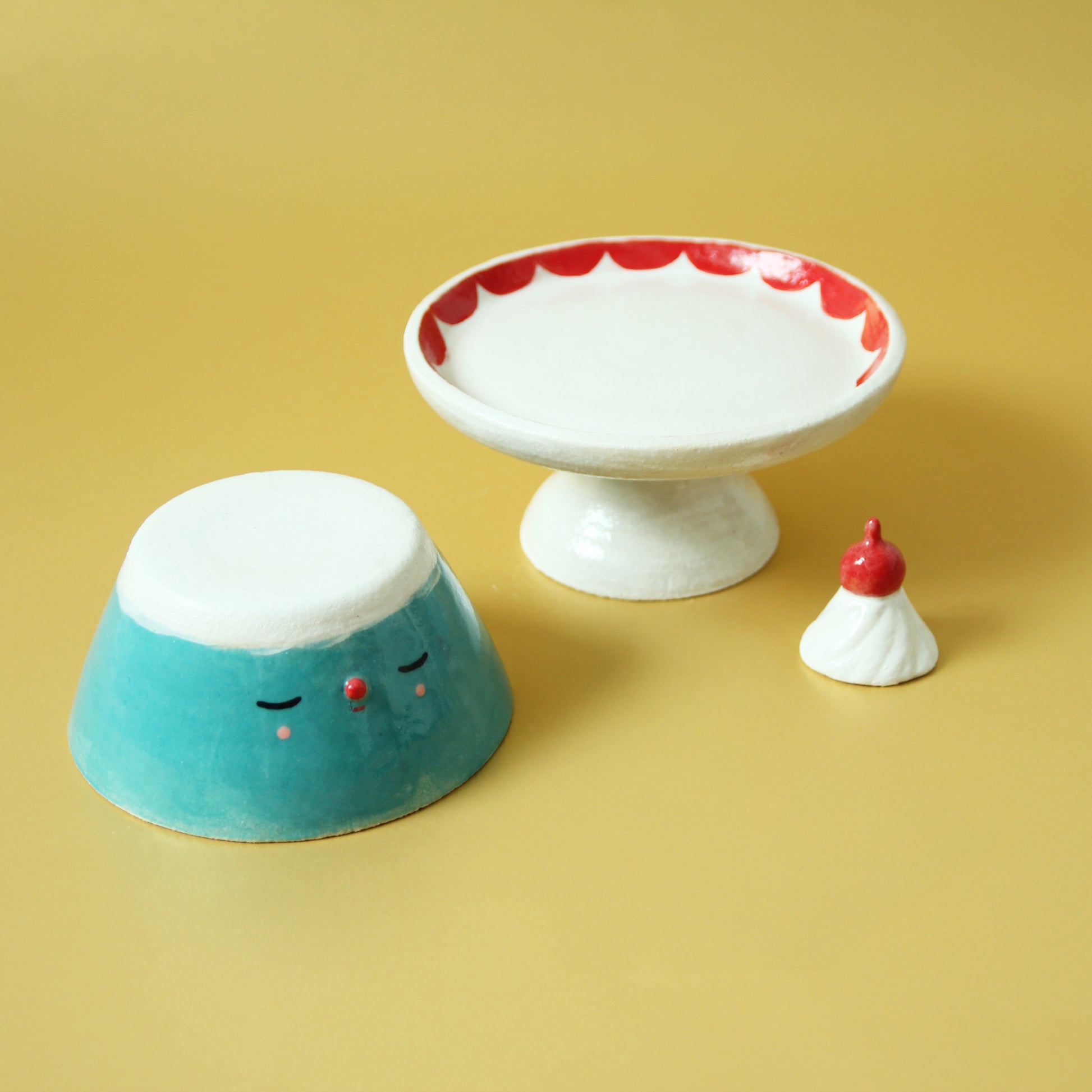 This 3-piece Fuji san pudding set consists of a Fuji san pudding, a cake stand, and removable fresh cream and cherry so that you can turn the pudding around and use it as a bowl!